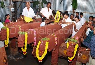 தஞ்சாவூர்: பெரியகோவிலுக்கு புதிய பிரம்மாண்டமான தேர், 50 லட்சம் ரூபாய் மதிப்பில் அமைப்பு பணிகள், தற்போது தீவிரமாக நடந்து வருகிறது. இதன் ஒருபகுதியாக, தேர் அடிப்பாகம் பொருத்தும் பணியை, சிறப்பு பூஜை நடத்தி, ஸ்தபதிகள் துவங்கினர். தஞ்சை பெரியகோவிலுக்கு பிரம்மாண்டமான புதிய தேர் செய்வதற்காக, 50 லட்சம் ரூபாயை தமிழக அரசு ஒதுக்கியது. இதை கடந்த சட்டசபை தொடரில், முதல்வர் ஜெயலலிதா அறிவித்தார். இதையடுத்து தஞ்சையில் கடந்த செப்., மாதம், 16ம் தேதி பெரியகோவிலுக்கு தேர் செய்யும் பணி துவங்கப்பட்டது. தஞ்சை மேலவீதியிலுள்ள ஸ்ரீ கொங்கணேஸ்வரர் கோவில் மற்றும் ஸ்ரீ ராமர் கோவிலில் தேர் செய்யும் பணிகள், இரு பிரிவாக நடந்தது. தொடர்ந்து தற்போது ராமர் கோவில் அருகில் பெரியதாக "ஷெட் போடப்பட்டு, அதில் தேர் பாகங்கள் செய்யும் பணி தீவிரமாக நடந்து வருகிறது. இப்பணிகளில், ஸ்தபதி அரும்பாவூர் வரதராஜன் தலைமையில், ஸ்தபதிகள் ஈடுபட்டுள்ளனர். இதையடுத்து தேர் அடிப்பாகம் பொருத்தும் பணி நேற்று துவங்கியது. இதற்குரிய சம்பிரதாயப்படி, சிறப்பு பூஜை காலை, 11 மணிக்கு நடந்தது. இதில் அ.தி.மு.க., விவசாய பிரிவு மாநில செயலாளர் தங்கமுத்து, எம்.எல்.ஏ., ரங்கசாமி மற்றும் ஹிந்து அறநிலையத்துறை அதிகாரிகள் பங்கேற்றனர். பின் ஸ்தபதி வரதராஜன் கூறியதாவது: தஞ்சை பெரியகோவில் தேரில் முதல் அங்கணம் அமைக்கும் பணி தற்போது துவங்கியுள்ளது. முதல் கட்ட பணியில், ஒன்றரை அடி உயரத்தில், 40 சிற்பங்களும், 2ம் கட்ட பணியில் இரண்டேகால் அடி உயரத்தில், 56 சிற்பங்களும், 3ம் கட்ட பணியில், ஒன்றரை அடி உயரத்தில், 56 சிற்பங்களும் செதுக்கப்படும். தரைமட்டத்தில் இருந்து சிம்மாசனம் மட்டம் வரை, பதினாறு அரை அடி உயரத்தில் தேர் அமைக்கப்படும். ஒவ்வொரு சக்கரமும், ஆறரை அடி உயரமும், அச்சு நீளம், பதினான்கரை அடி உயரமும் உடையது. தேர் அமைப்பு பணி நிறைவடைந்தவுடன் நான்கு புறமும், 160 மணிகள் பொருத்தப்படும்,இவ்வாறு அவர் கூறினார்.
