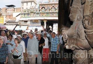 மதுரை: இந்தியாவுக்கு சுற்றுலா வந்துள்ள வெளிநாட்டு சுற்றுலா கப்பல் பயணிகள், நேற்று மதுரை மீனாட்சி அம்மன் கோயில், திருமலை நாயக்கர் மகாலை கண்டு ரசித்தனர். அமெரிக்கா, இங்கிலாந்து உள்ளிட்ட பல்வேறு நாடுகளை சேர்ந்த 364 பயணிகள் "வாயேஜர் சுற்றுலா கப்பலில் சுற்றுலா பயணம் மேற்கொண்டுள்ளனர். பல்வேறு நாடுகளின் கடற்கரை நகரங்களை கண்டு களித்தவர்கள் இந்தியாவில் போர்பந்தர், கொச்சி, கோவா போன்ற நகரங்களுக்கு சென்று, நேற்று தூத்துக்குடி துறைமுகம் வந்தனர். அவர்களில் 90 பேர், மதுரைக்கு நேற்று அழைத்து வரப்பட்டு மீனாட்சி அம்மன் கோயில், திருமலை நாயக்கர் மகாலை காண டிராவல் கிளப் ஏற்பாடுகளை செய்தது. 57 பேர் தூத்துக்குடி மாவட்டம் சாயர்புரத்தில் உள்ள போப் நினைவிடம், சர்ச் கல்லூரியை பார்வையிட்டு,தமிழர்களின் பண்பாடுகள் குறித்து வீடியோ, போட்டோக்கள் எடுத்துக்கொண்டனர். மீதமுள்ளவர்கள் தூத்துக்குடி டவுன் பகுதியில் உள்ள பனிமயமாதா சர்ச் உள்ளிட்ட பல்வேறு இடங்களை சுற்றிப்பார்த்தனர். மதுரைக்கு நேற்று மதியம் 1.45 மணிக்கு மீனாட்சி கோயிலுக்கு வந்த சுற்றுலா பயணிகளை , டிராவல் கிளப் தலைவர் முஸ்தபா, செயலாளர் செந்தில்நாதன், நிர்வாகிகள் ஜெயக்குமார், பாரதி, சுந்தர், கோயில் இணை கமிஷனர் ஜெயராமன் ஆகியோர் மல்லிகைப் பூ கொடுத்து வரவேற்றனர். நடை மூடப்பட்டிருந்த போதும், அவர்கள் கோயிலுக்குள் செல்ல சிறப்பு அனுமதி வழங்கப்பட்டது. ஆயிரங்கால் மண்டபம், பொற்றாமரைக்குளம், ஆடி வீதிகளை ஒரு மணி நேரம் அவர்கள் பார்வையிட்டனர். கோயில் சிற்பங்களையும், நான்கு கோபுரங்களையும் ரசித்தனர். மகாலை பார்வையிட்ட பின் தூத்துக்குடி சென்றனர். நேற்று இரவு 8.30 மணிக்கு தூத்துக்குடியில் இருந்து இலங்கை கொழும்பு துறைமுகத்திற்கு சென்றனர். இலங்கையை சுற்றி பார்த்து விட்டு கிறிஸ்துமஸ் பண்டிகைக்கு முன் தங்கள் நாடுகளுக்கு திரும்ப திட்டமிட்டுள்ளனர். கடந்த ஆண்டு இதே நாளில் மினர்வா நாட்டு சுற்றுலா சொகுசு கப்பலில் சுற்றுலா பயணிகள் தூத்துக்குடிக்கு வந்து சென்றது குறிப்பிடத்தக்கது. டிராவல் கிளப் தலைவர் முஸ்தபா, ""மதுரை சுற்றுலா மேம்பாடு அடைய வெளிநாட்டு பயணிகள் அழைத்து வரப்பட்டனர். இவர்கள் மூலம் சுற்றுலா பயணிகளின் எண்ணிக்கை அதிகரிக்க வாய்ப்புகள் உண்டு, என்றார். இணை கமிஷனர் ஜெயராமன், ""வெளிநாட்டவர் கோயிலில் பார்வையிடும் இடங்களை மட்டும் சுற்றுலா பயணிகள் கண்டு ரசித்தனர். அவர்கள் விருந்தினர் என்பதால், நடை மூடப்பட்ட போதும், சிறப்பு அனுமதி வழங்கப்பட்டது. இது நடைமுறையில் இருப்பது தான். உயர்ந்த கோபுரங்கள், சிற்பங்கள், மேற்புற வர்ண பூச்சுகளை கண்டு வியந்தனர், என்றார்.