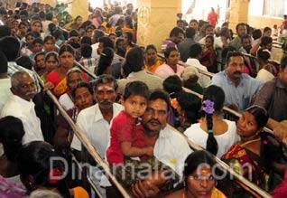 ஆனைமலை: ஆனைமலை மாசாணியம்மன் கோவிலில், ஆங்கில புத்தாண்டு மற்றும் அமாவாசையை முன்னிட்டு நடந்த சிறப்பு பூஜையில், அம்மனை தரிசிக்க ஆயிரக்கணக்கான பக்தர்கள் குவிந்தனர். கோவை மாவட்டத்தில் பிரசித்தி பெற்ற கோவில்களில் ஆனைமலை மாசாணி அம்மன் கோவில் முக்கியமானது. இங்கு சயன நிலையில் காட்சி தரும் மாசாணி அம்மனை தரிசிக்க, தமிழகத்தின் பல்வேறு பகுதிகளில் இருந்து மக்கள் வருகை தருகின்றனர். ஆங்கில புத்தாண்டு மற்றும் அமாவாசையை முன்னிட்டு, நேற்று முன்தினம் இரவு முதலே கோவில் நடை திறந்திருந்தது. மாவட்டத்தின் பல பகுதிகளில் இருந்து, கோவிலுக்கு சிறப்பு பஸ்கள் இயக்கப்பட்டன. நேற்று முன்தினம் இரவு முதல் ஆயிரக்கணக்கான பக்தர்கள் கோவில் வளாகத்தில் குவியத் தொடங்கினர். அமாவாசை, புத்தாண்டை முன்னிட்டு நேற்று அம்மனுக்கு சிறப்பு பூஜைகள் நடந்தன. காலை முதல் பக்தர்கள் வரிசையில் காத்திருந்து அம்மனை தரிசித்தனர்.