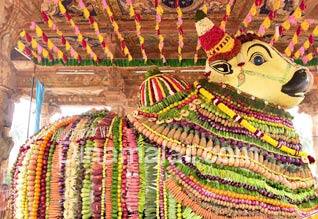 தஞ்சாவூர்: தஞ்சை பெரிய கோவிலில், மகர சங்கராந்தியை முன்னிட்டு, மகா நந்தியம் பெருமானுக்கு, 3 டன் எடையில், காய்கறி, பழங்கள் மற்றும் இனிப்பு வகைகளால் அலங்காரம் செய்யப்பட்டது. மேலும், 108 பசு, கன்றுகளுக்கு, சிறப்பு பூஜையும் நடத்தது. மகர சங்கராந்தி பெருவிழாவை முன்னிட்டு, தஞ்சை பெரிய கோவிலில், மூலவர் பிரகதீஸ்வரருக்கு, கடந்த, 14 மற்றும் 15ம் தேதிகளில், பல்வேறு திரவிய பொருட்களால் சிறப்பு அபிஷேகம் நடந்தது. கோவில் வளாகத்தில் உள்ள, மகா நந்திக்கு, 14ம் தேதி மாலை, 6:00 மணிக்கு, 10 வகையான அபிஷேகம் நடந்தது. தொடர்ந்து, நேற்று காலை, 8:00 மணி முதல், 9:00 மணி வரை, மகா நந்திக்கும், சுற்று வட்டாரத்தில் இருந்து வரவழைக்கப்பட்ட, 108 பசு மற்றும் கன்றுகளுக்கும், பூஜை நடந்தது. முன்னதாக, 3 டன் எடையில், காய்கறி, பழங்கள், இனிப்பு வகைகளில், மகா நந்திக்கு சிறப்பு அலங்காரம் செய்திருந்தனர். இதில், ஆயிரக்கணக்கான பக்தர்கள் பங்கேற்று, மூலவர் பிரகதீஸ்வரர் மற்றும் மகாநந்தியம் பெருமானை தரிசனம் செய்தனர்.