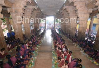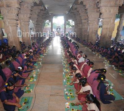 மதுரை: மதுரை தெப்பக்குளம் மரகதவல்லி சமேத முக்தீஸ்வரர் கோயிலில் இன்று 1500 மாணவிகளின் திருவிளக்கு பூஜை நடந்தது. உலக உயிர்களின் நன்மைக்காகவும், கல்வி அறிவு பெருகவும் நடந்த இந்த விளக்குபூஜை, மீனாட்சி சுந்தரேஸ்வரர் பெண்கள் மேல்நிலைப்பள்ளி மாணவிகளால் 1983ம் ஆண்டு முதல் நடத்தப்பட்டு வருகிறது. தைவெள்ளி, மற்றும் ஆடி வெள்ளிக்கிழமைகளில் நடைபெறும் இந்த விளக்கு பூஜையில் சுமார் ஆயிரத்து ஐநூறு மாணவிகள் கலந்து கொள்கின்றனர். பள்ளி இறுதி தேர்வு எழுதுவதற்கு முன், அனைவரும் சிறந்த மதிப்பெண் பெற்று தேர்வில் வெற்றி பெற வேண்டும் என்பதற்காக தை மாதத்தில் ஒரு விளக்கு பூஜையும், விடுமுறை முடிந்து பள்ளி துவங்கும் போது மாணவர்கள் நல்ல உடல்நிலை மற்றும் சிறந்த மனநிலையுடன், படிக்க வேண்டும் என்பதற்காக ஆடி மாதத்தில் ஒரு விளக்கு பூஜையும் நடத்தப்படுகிறது. இவ்வாறு வருடத்திற்கு இரண்டு முறை விளக்கு பூஜை செய்வதினால் இறைவனின் அருள் கிடைப்பதுடன், கல்வி அறிவும், ஞாபக சக்தியும் பெருகுவதாக மாணவிகள் கூறுகின்றனர்.