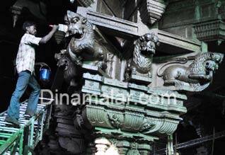 ராமேஸ்வரம்: ராமேஸ்வரம் கோயிலில் பழமை மாறாமல் தூண்கள், சிற்பங்கள் வார்னிஷ் முலம் பளீச்சென மாற்றப்பட்டு வருகிறது. ராமேஸ்வரம் ராமநாதசுவாமி கோயிலில், இந்த கும்பாபிஷேகம் நடத்த இந்து அறநிலைத்துறை திட்டமிட்டு ஏற்பாடுகளை செய்து வருகிறது. கோயில் மூன்றாம் பிரகாரம், சேதுபதி மண்டபம் சீரமைக்கப்பட்டதை அடுத்து சுவாமி, பர்வதவர்த்தினி அம்மன் சன்னதி, முதல் பிரகார தூண்கள், சிற்பங்கள் பழமை மாறாமல் இருக்க, 50 லட்ச ரூபாயில் மராமத்து பணி நடந்தது. இதில் கருங்கல் தூண், சிற்பங்களை வாட்டர் பிரஷர் வேட்டிவ் செய்து, இறுதியாக பாலிமர் கோட்டிங்(ரசாயன கலவை) பூசும் பணி நடந்து வருகிறது. இப்பணி ஒரிரு மாதங்களில் முடிந்தவுடன் தூண்கள், சிற்பங்கள் கலை அம்சம் மாறாமல், பளிச் சென காட்சியளிக்கும். பழங்காலத்தில் தூண், சிற்பங்கள் நிறுவியது போன்ற தோற்றத்தை பக்தர்கள் கண்டு ரசிக்கலாம் என, கோயில் அதிகாரிகள் தெரிவித்தனர்.
