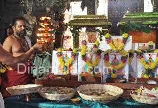 ராமேஸ்வரம்: ராமேஸ்வரம் ராமநாதசுவாமி கோயிலில் கும்பாபிஷேகத்தை முன்னிட்டு திருப்பணிகள் துவக்குவதற்காக, நேற்று பாலாலய பூஜை நடந்தது.ராமேஸ்வரம் ராமநாதசுவாமி கோயில் கும்பாபிஷேகம், இந்தாண்டு இறுதியில் நடைபெற உள்ளது. சுவாமி, பர்வதவர்த்தினி அம்மன், விநாயகர் சன்னதி உள்ளிட்ட 21 சன்னதிகளின் விமானங்கள், கிழக்கு, மேற்கு ராஜகோபுரத்திற்கு திருப்பணி நடத்த, நேற்று முன்தினம் கோயிலில் முதல்கால யாக பூஜை துவக்கி, நேற்று காலை 2ம் கால யாக பூஜை, கஜ பூஜை, கோ பூஜை நடந்தது.பின். பிள்ளையார்பட்டி பிச்சை குருக்கள் தலைமையில் ராமேஸ்வரம் கோயில் குருக்கள் கணபதி ராம், 27 சிவாச்சாரியார்கள் மந்திரம் முழங்க, புனித கலசங்களில் பூர்ணாகுதி, மகா தீபாராதனை, பாலாலய பூஜை நடந்தது. கோயில் கமிஷனர் செல்வராஜ், தக்கார் குமரன் சேதுபதி, பா.ஜ., தேசிய பொதுக்குழு உறுப்பினர் முரளீதரன் உட்பட ஏராளமானோர் பங்கேற்றனர்.