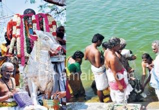 காஞ்சிபுரம்: ஏகாம்பரநாதர் கோவிலில், பங்குனி உத்திர திருக்கல்யாண பிரம்மோற்சவத்தின் நிறைவு நாளான நேற்று, சர்வ தீர்த்த குளத்தில், தீர்த்தவாரி நடந்தது. காஞ்சிபுரம், ஏகாம்பரநாதர் கோவில் பங்குனி உத்திர திருவிழாவின் கடைசி நாளான நேற்று, சர்வ தீர்த்த குளத்தில் தீர்த்தவாரிக்காக, பகல், 11:30 மணிக்கு, கோவிலில் இருந்து, சந்திரசேகர் வெள்ளி ரிஷப வாகனத்தில் புறப்பட்டார். நான்கு ராஜ வீதிகள் உலா வந்து பிற்பகல், 2:00 மணிக்கு, சர்வ தீர்த்தகுளம் வந்தடைந்தார். அங்கு சந்திரசேகராக கருதப்பட்ட சூலாயுதத்திற்கு, குளத்தில் வைத்து, யாகத்திற்காக வைத்திருந்த புனித நீரால், அபிஷேகம் செய்யப்பட்டு, தீர்த்தவாரி நடைபெற்றது. தொடர்ந்து சிறப்பு பூஜைகள் நடத்தப்பட்டன அதன் பின்னர், மண்டபத்தில் எழுந்தருளிய உற்சவர் சந்திரசேகருக்கு, சிறப்பு தீபாராதனை நடந்தது. பின்னர், ரிஷப வாகனத்தில் கோவிலுக்கு திரும்பினார். ஏகாம்பரநாதர் பங்குனி உத்திர திருக்கல்யாண பிரம்மோற்சவம், நேற்றுடன் நிறைவு பெற்றது.