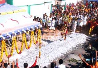 சத்தியமங்கலம்: மத நல்லிணக்கத்துக்கு எடுத்துக்காட்டாக திகழும், தாளவாடி மாரியம்மன் கோவிலில் குண்டம் விழா நடந்தது. பூசாரி மட்டும் தீ மிதித்தார். சத்தியமங்கலம் அடுத்துள்ளது தாளவாடி மலைப்பகுதி. இங்குள்ள, இஸ்லாமியர் வழிபாட்டு தளமான, தர்காவுக்கு முன், மாரியம்மன் கோவில் அமைந்து, மத நல்லிணக்கத்துக்கு எடுத்துக்காட்டாக விளங்குகிறது. இங்குள்ள மாரியம்மன் கோவிலில், குண்டம் விழா நடந்தால், இப்பகுதி இஸ்லாமியர்கள் ஆதரவு கொடுப்பார்கள். இதேபோல், இங்குள்ள தர்காவில் விழா நடந்தால், இப்பகுதி இந்துக்கள் ஒத்துழைப்பு கொடுப்பர். புகழ்மிக்க தாளவாடி மாரியம்மன் கோவிலில், குண்டம் விழா நேற்று காலை நடந்தது. கோவில் பூசாரி ராஜன்னா மட்டும் தீ மிதிப்பது வழக்கமாகும். இதன்படி கோவில் முன் அமைக்கப்பட்ட குண்டத்தில், பூசாரி ராஜன்னா மட்டும் தலையில் அம்மன் சிலையை சுமந்தவாறு, தீ மிதித்தார். முன்னதாக மாரியம்மன் பூ அலங்காரத்தில் பக்தர்களுக்கு அருள் பாலித்தார். பூசாரி தீ மிதிக்கும் முன், அம்மனை ஊஞ்சலில் வைத்து தாலாட்டினர். நேற்று முன்தினம் இரவு விடிய, விடிய மாரியம்மன் வீதிஉலா நடந்தது. பூசாரி தீ மிதிப்பதை இந்து, இஸ்லாமியர் என அனைத்து மத மக்களும் ஆர்வத்துடன் பார்த்து வணங்கினர்.