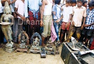 நாகப்பட்டினம்: நாகை அருகே ஆற்றில் 6 ஐம்பொன்சிலைகள் மற்றும் 2 பெட்டகங்கள் கண்டெடுக்கப்பட்டன. நாகை அடுத்த கலசம்பாடியைச் சேர்ந்தவர்கள் சுமதி மற்றும் கல்யாணி. இருவரும் நேற்று மதியம் தென்கால் ஒரத்துார் கடுவையாற்றில் மீன்பிடித்தனர். அப்போது, சேற்றில் புதைந்த நிலையில் சிலைகள் இருந்தன. இதுகுறித்து கிராம மக்களுக்கு தகவல் தெரிவித்தனர். கிராம மக்கள் கும்பலாக வந்து ஆற்றில் இறங்கி, மூன்றரை அடி உயர விளக்கு நாச்சியர், ஒன்றரை அடி உயர விநாயகர், சரஸ்வதி, லெட்சுமி, ஒன்னேகால் அடி உயர சந்திரசேகரர், முக்கால் அடி உயர மற்றொரு லெட்சுமி சிலைகள் என ௬ சிலைகள் மற்றும் ௨ பெட்டகங்களை ஆற்றில் இருந்து வெளியே எடுத்து வந்தனர். சிலைகள் அனைத்தும் ஐம்பொன்னால் ஆனவை. இது குறித்து தகவலின் பேரில், வேளாங்கண்ணி போலீசார், சிலைகள் மற்றும் பெட்டகங்களை கைப்பற்றி, கண்டெடுக்கப்பட்ட சிலைகள் எந்த நுாற்றாண்டை சேர்ந்தது, ஏதாவது கோவிலில் கொள்ளையடிக்கப்பட்டு ஆற்றில் வீசப்பட்டதா என விசாரித்து வருகின்றனர். வருவாய்த்துறையினரும் இதுகுறித்து விசாரிக்கின்றனர்.
