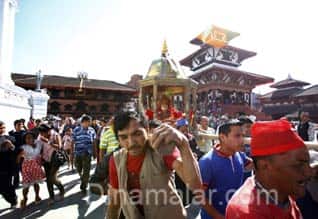 காத்மாண்டு: நேபாளில் இந்து கோயில் திருவிழாவில் சிறுமியை வாழும் தெய்மாக வழிபடும் மரபினை அந்நாட்டு இந்துக்கள் கடைபிடித்து வருகின்றனர். நேபாள் தலைநகர் காத்மாண்டுவில் உள்ள ஒரு இந்து கோயிலில் கோடே ஜாத்ரா என்ற பண்டிகை ஆண்டு தோறும் கொண்டாடப்பட்டு வருகிறது. நேற்று நடந்த இக்கோயில் திருவிழாவின் போது , சிறுமி ஒருவரை கடவுளாக பாவித்து அச்சிறுமியை அம்மன் வேடமாக அலங்கரித்து பல்லக்கில் தூக்கி வந்து கோயிலை வலம் வருகின்றனர். அப்போது கோயிலுக்கு வரும் பக்தர்கள் சிறுமியை வாழும் தெய்வமாக வழிபடுகின்றனர்.