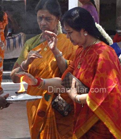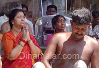 திருப்புவனம்: தி.மு.க.,விலிருந்து நீக்கப்பட்ட அழகிரியின் மனைவி காந்தி, சிவகங்கை மாவட்டம், மடப்புரம் பத்ரகாளி அம்மன் கோவிலில், நேற்று மதியம் வழிபாடு நடத்தினார். திருப்புவனம் அருகேயுள்ள இந்த பத்ரகாளி அம்மன் கோவிலில் வேண்டினால், "நினைத்த காரியம் கைகூடும் என்ற நம்பிக்கையில், ஏராளமான பக்தர்கள் வருகின்றனர். தி.மு.க., வில் இருந்து சமீபத்தில் நீக்கப்பட்ட அழகிரியின் மனைவி காந்தி அழகிரி, இக்கோவிலுக்கு நேற்று தன் சகோதரியுடன், உச்சிக் கால பூஜையில் பங்கேற்றார். அம்மனுக்கு பட்டாடை சாத்தி, நெய்விளக்கு ஏற்றி, சிறப்பு பூஜை செய்து வழிபட்ட இவர்கள், கோவிலில், 20 நிமிடம் இருந்து விட்டு, காரில் புறப்பட்டனர்.
