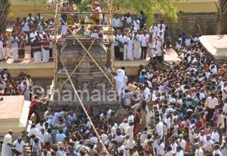 பரமக்குடி : நயினார்கோவில் நாகநாதசுவாமி கோயில் கும்பாபிஷேக விழா, நேற்று கோலாகலமாக, ஆயிரக்கணக்கான பக்தர்கள் மத்தியில் பக்தி பரவசத்துடன் நடந்தது. பரமக்குடி அருகே ஆயிரக்கணக்கான ஆண்டுகளுக்கு உருவான இந்த கோயில் மூர்த்தி, தீர்த்தம், தலம் ஆகிய சிறப்பு வாய்ந்தது. கடந்த 15 ஆண்டுகளுக்கு பின் நேற்று இந்த கோயிலில் கும்பாபிஷேகம் நடந்தது. இதை முன்னிட்டு கோயில் முழுவதும் கருங்கல்லில் பூசப்பட்டிருந்த சுண்ணாம்பு பெயர்த்து எடுக்கப்பட்டு, ஆயில் பூசி புதுப்பொலிவுடன் காட்சியளிக்கிறது. பல ஆண்டுகளாக பராமரிப்பின்றி பூட்டப்பட்டிருந்த பள்ளியறை புதுப்பிக்கப்பட்டுள்ளது. இதே போல் ராஜகோபுரம் உள்ளிட்ட அனைத்து பரிவார கோபுரம், பிரகாரத்தில் சிமென்ட் தளம் அமைக்கப்பட்டுள்ளது. கடந்த ஏப்., 4 ல் கும்பாபிஷேக விழா துவங்கி, தொடர்ந்து ஐந்து கால யாக பூஜைகள் நிறைவடைந்து, நேற்று அதிகாலை 4 மணிக்கு ஆறாம் கால யாக பூஜை, பூர்ணாகுதி நடந்தது. பின்னர் புனித தீர்த்த குடங்கள் புறப்பாடாகி, காலை 9.15 மணிக்கு திருப்பரங்குன்றம் ராஜா பட்டர் தலைமையில் மகா கும்பாபிஷேகம் நடந்தது. பரமக்குடி, ராமநாதபுரம், இளையான்குடி, மதுரை, சென்னை மற்றும் சுற்றுவட்டார கிராமமக்கள் ஆயிரக்கணக்கானோர் விழாவில் கலந்து கொண்டனர். நயினார்கோவில் முழுவதும் ஆங்காங்கே நீர், மோர் பந்தல், பொங்கல், அன்னதானம் வழங்கப்பட்டது. ஏற்பாடுகளை சமஸ்தான தேவஸ்தானம் பரம்பரை அறங்காவலர் சேதுபதிராணி ராஜேஸ்வரி நாச்சியார், திவான் மகேந்திரன், பொறுப்பாளர் தெய்வச்சிலைராமசாமி செய்திருந்தனர். நயினார்கோவில் ஒன்றிய கவுன்சிலர் பழனிஜெகதீஸ்வரி, ஊராட்சி தலைவர்கள் நாகவள்ளி(நயினார்கோவில்), பூமிநாதன்(வாணியவல்லம்), முதல்நிலை ஒப்பந்தகாரர் காந்தி, முன்னாள் ஒன்றிய கவுன்சிலர் பூமா, அறிவானந்தபாண்டியன் மெட்ரிக் பள்ளி தாளாளர் செல்வராஜ், சேவாபாரதி நவசக்தி, கணபதி, சுகுமாறன், லோகி உள்ளிட்ட பலர் கலந்து கொண்டனர்.