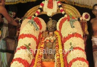 ஸ்ரீபெரும்புதூரில், ராமானுஜர் மங்களகிரியில் எழுந்தருளி வீதி உலா வந்தார். ஸ்ரீபெரும்புதூரில், ஆதிகேசவப் பெருமாள் மற்றும் பாஷ்யகார சுவாமி கோவிலில் சித்திரை மாத பிரமோற்சவத்தை தொடர்ந்து, கடந்த 25ம் தேதி, ராமானுஜர் உற்சவம் துவங்கியது. ராமானுஜர், நேற்று முன்தினம் மாலை 7:30 மணிக்கு, வண்ண மலர்களால் அலங்கரிக்கப்பட்ட மங்களகிரியில் எழுந்தருளினார். வாண வேடிக்கைகளுடன் வீதி உலா வந்தார். ஐந்தாம் நாள், உற்சவமான நேற்று காலை, 6:30 மணிக்கு, ராமானுஜர் அலங்கரிக்கப்பட்ட பல்லக்கில் எழுந்தருளி, கோவிலில் இருந்து, புறப்பட்டு, தேரடி, காந்தி ரோடு, செட்டி தெரு, திருமங்கையாழ்வார் தெரு, வடபுஷ்கரணி தெரு வழியாக வந்து, பக்தர்களுக்கு அருள்பாலித்தார்.