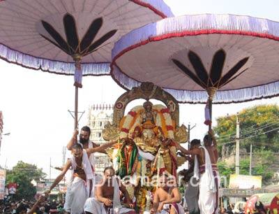 காஞ்சிபுரம்: பக்தர்கள் வெள்ளத்தில், வரதராஜபெருமாள் கருட வாகனத்தின் மீது, வீதியுலா வந்தார். காஞ்சிபுரம் நகரில் அமைந்துள்ள வரதராஜபெருமாள் கோவிலில், கடந்த 12ம் தேதி கொடியேற்றத்துடன், வைகாசி மாத பிரம்மோற்சவம் நடந்து வருகிறது. இதி்ல், மூன்றாம் நாள் உற்சவமான பிரசித்தபெற்ற கருடசேவை உற்சவம் நடந்தது. இதில், அதிகாலை 4:20 மணிக்கு மலர்களால் அலங்கரிக்கப்பட்ட கருட வாகனத்தின் மீது, வரதராஜ பெருமாள் திருஆபரணம் அணிந்து எழுந்தருளினார். பின்னர், கோபுர வாசலில், தொட்டாட்சியர் சேவை மற்றும் கோபுர தரிசன சேவை நடந்தது. பின்னர், முன்புறம் அத்யபாக கோஷ்டியும், பின்புறம் வேதபாராயண கோஷ்டிகள் வேதமந்திரங்கள் ஓத, சூரிய மேளம், பேரிமேளம், குதிரை, யானை புடைசூழ, பக்தர்கள் வெள்ளத்தில் கருட வாகனத்தின் மீது வரதராஜபெருமாள், பிள்ளையார்பாளையம் மற்றும் நான்கு ராஜவீதிகள் மற்றும் முக்கிய வீதிகளில், வீதியுலா வந்து பக்தர்களுக்கு அருள் பாலித்தார். பின்னர், பகல் 12:30 மணிக்கு மீண்டும் கோவிலை வந்தடைந்தார். அங்கு பெருமாளுக்கு திருமஞ்சனம் நடந்தது. கருடசேவை உற்சவத்தை முன்னிட்டு, காஞ்சிபுரம் மாவட்டத்திற்கு உள்ளூர் விடுமுறை விடப்பட்டது. இதனால், மாவட்டத்தின் பல்வேறு பகுதியில் இருந்து, ஆயிரக்கணக்கான பக்தர்கள், பெருமாளை தரிசிப்பதற்காக நகரத்தில் குவிந்தனர். மேலும், பக்தர்களுக்காக பல்வேறு இடங்களில் அன்னதானம், நீர்மோர் ஆகியவை வழங்கப்பட்டன. மாவட்ட எஸ்.பி.விஜயக்குமார் தலைமையில், நூற்றுக்கும் மேற்பட்ட போலீசார், பாதுகாப்பு பணியில் ஈடுபட்டனர்.