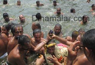 காஞ்சிபுரம் : பக்தர்கள் வெள்ளத்தில், அனந்த சரஸ் புஷ்கரணியில் வரதராஜ பெருமாளுக்கு தீர்த்தவாரி நடைபெற்றது. காஞ்சிபுரம் வரதராஜ பெருமாள் கோவிலில், வைகாசி மாத பிரம்மோற்சவம் கடந்த 12ம் தேதி துவங்கி நடந்து வருகிறது. ஒன்பதாம் நாள் உற்சவமாக நேற்று காலை, 6:00 மணிக்கு வரதராஜ பெருமாள் பல்லக்கில் வீதியுலா சென்றார்.மீண்டும் காலை 9:30 மணிக்கு கோவிலை வந்தடைந்த, வரதராஜ பெருமாள், ஸ்ரீதேவி, பூதேவியுடன் 10:00 மணிக்கு கல்யாண மண்டபத்தில் எழுந்தருளினார். அங்கு, சிறப்பு ஆராதனைகள் மற்றும் அர்ச்சனைகள் நடந்தன.அதன்பின், பகல் 10:50 மணிக்கு பக்தர்கள் புடைசூழ ஊர்வலமாக சென்ற வரதர், நீராழி மண்டபத்தின் எதிரே உள்ள மண்டபத்திற்கு வந்தார். அங்கு, வரதர் முன்னிலையில், அனந்த சரஸ் புஷ்கரணிக்கு, பெருமாளுக்கு நைவேத்தியம் செய்யப்பட்ட தயிர் சாதம், பிரசாதமாக வீசப்பட்டது. பின்னர், உற்சவர் வரதராஜ பெருமாள் அனந்த புஷ்கரணியில் இறங்கினார். சுவாமியை தொடர்ந்து, ஆயிரக்கணக்கான பக்தர்கள் கோவிந்தா என, கூறியவாறு குளத்தில் மூழ்கி புனித நீராடினர்.சில நிமிடங்களில் அனந்த சரஸ் புஷ்கரணியில் மூழ்கி, வெளியே வந்த வரதராஜ பெருமாள், உற்சவ அறைக்கு புறப்பட்டு சென்றார். தீர்த்தவாரி உற்சவத்தை காண காஞ்சிபுரம் மற்றும் அதனை சுற்றியுள்ள பகுதிகளில் இருந்து, ஏராளமான பக்தர்கள் கோவிலில் குவிந்ததனர்.