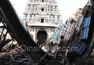 காரைக்குடி: கோயில் மண்டபத்தின், கான்கிரீட் சுவர் இடிந்து விழுந்து, 4 பெண்கள் உட்பட 8 பேர் காயமடைந்தனர். 2 பேர் மதுரை அரசு மருத்துவமனைக்கு கொண்டு செல்லப்பட்டுள்ளனர். காரைக்குடி சிவன்கோயில் வீதியில், உள்ள சிவன் கோயிலில், 42 அடி அகலம், 48 அடி நீளத்திற்கு, முன் மண்டபம் கட்டும் பணி, கடந்த 4 மாதங்களாக நடந்து வருகிறது. கடந்த மே 21ல், கான்கிரீட் போடப்பட்ட நிலையில், நேற்று மேல் மட்டத்தில், பீம் அமைக்கும் பணி நடந்தது. 15க்கும் மேற்பட்டோர் பணியில் ஈடுபட்டிருந்தனர்.மதியம் 2:30 மணிக்கு, மண்டபத்தின் மேற்கூரை பாரம் தாங்காமல் இடிந்து விழுந்தது. மண்டபத்தின் மேல், கட்டட பணியில் இருந்த அரியக்குடி சிட்டாள்,42, மணச்சை கண்ணன்,42, கோட்டையூர் உமையாள்,45, பெரியகோட்டை நாகராஜ்,35, அழகாபுரி கலா,34, கோட்டையூர் ராக்கு,35, எஸ்.கணேசன்,32, புதுவயல் பி.பழனியப்பன்,43 காயமடைந்தனர். மேலும் சிலருக்கு லேசான காயம் ஏற்பட்டது.தீயணைப்பு நிலைய அலுவலர் குமார் தலைமையிலான வீரர்கள், காயமடைந்தவர்களை தீயணைப்பு வாகனத்தில் ஏற்றி, மருத்துவமனைக்கு கொண்டு சென்றனர். எஸ்.கணேசனின் விலா எலும்பில், கட்டை குத்தியதாலும், பி.கணேசனுக்கு நெற்றியில் அடிபட்டதாலும், அவர்கள் மதுரை அரசு மருத்துவமனைக்கு மேல் சிகிச்சைக்காக அழைத்துச் செல்லப்பட்டனர்.காரைக்குடி தெற்கு போலீசார் இன்ஜினியரிங் சூப்பர்வைசர் சரவணனிடம், பிளான் போட்டு கொடுத்தது யார்? எதற்காக அவசர கோலத்தில் பணிகள் மேற்கொள்ளப்பட்டது, என விசாரிக்கின்றனர்.விபத்து நடந்த நேரம் மதியம் 2:30 மணி என்பதால், கோயில் நடை மூடப்பட்டிருந்தது. இதனால், உயிர் சேதம் இல்லை. கடந்த 2 நாளுக்கு முன்பு தான், மேற்கூரை கான்கிரீட் போடப்பட்டுள்ளது. அதன் ஈரம் காய்வதற்குள் பீம் அமைக்கும் வேலையை ஆரம்பித்ததால், இந்த விபத்து ஏற்பட்டுள்ளது, என காயமடைந்தவர்கள் கூறினர்.