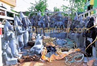செஞ்சி: செஞ்சி அருணாசலேஸ்வரர் கோவிலில் கும்பாபிஷேகத்திற்கு பிரதிஷ்டை செய்ய உள்ள சாமி சிலைகள் கரிக்கோல ஊர்வலம் நடந்தது. செஞ்சி பீரங்கிமேடு அருணாசலேஸ்வரர் கோவில் திருப்பணிகள் முடிந்து, ஜூன் 1ம் தேதி மகா கும்பாபிஷேகம் செய்ய உள்ளனர். இதற்காக புதிதாக வெங்கடேச பெருமாள் , பிரம்மா, நர்தன விநாயகர், ஆஞ்சநேயர், தன்வந்தரி, தட்சணாமூர்த்தி, லிங்கோத்பவர், கலாபைரவர், சூரியன், நவக்கிரகங்கள், 18 சித்தர்கள், தியான லிங்கம் ஆகியனவற்றை பிரதிஷ்டை செய்ய உள்ளனர். நேற்று பிரதிஷ்டை செய்ய உள்ள சாமி சிலைகளை நகர வீதிகள் வழியாக கரிக்கோலம் எடுத்து வந்தனர். இந்த சிலைகளுக்கு பொதுமக்கள் ஆரத்தி எடுத்து பூஜை செய்தனர்.