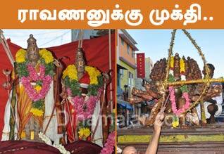 ராமேஸ்வரம்: ராமேஸ்வரம் ராமநாதசுவாமி கோயிலில் ராமலிங்க பிரதிஷ்டை திருவிழாவை முன்னிட்டு ராவணனுக்கு முக்தி அளித்தல் நிகழ்ச்சி நடைபெற்றது. விழாவானது வெள்ளிக்கிழமை காலையில் சிறப்பு பூஜையுடன் துவங்கியது. அதனைத் தொடர்ந்து ராமநாதசுவாமி, பர்வதவர்த்தினி சன்னதியில் தீபாராதனை வழிபாடுகள் நடைபெற்றன.பின்னர் திருக்கோயிலிலிருந்து மாலை 5 மணிக்கு ஸ்ரீ ராமர், ஸ்ரீ லெட்சுமணர், ஆஞ்சநேயர், சுக்ரிவன், சீதா தேவி ஆகியோர் தங்க கேடயத்திலும், ராவணன் மரக்கேடயத்திலும் புறப்பாடாகி 4 ரத வீதிகளில் உலா வந்தனர். தொடர்ந்து ராமேஸ்வரம் திட்டக்குடி கார்னரில் ராவண சம்ஹார நிகழ்ச்சி நடைபெற்றது.நிகழ்ச்சியில் ஏராளமான பக்தர்கள் கலந்து கொண்டு சுவாமி தரிசனம் செய்தனர்.