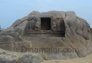 மாமல்லபுரம்: மாமல்லபுரம் கடற்கரைக்கோவில் அருகே, நீர்பரப்பு பகுதி வறண்டு மணல்வெளியாக மாறியதால், மகிஷாசுரமர்த்தினி குகை சிற்பம் தெரியவந்துள்ளது. மாமல்லபுரத்தில், கடற்கரைக்கோவில் முக்கிய பாரம்பரிய கலைச்சின்னமாக விளங்குகிறது. இக்கோவில், கடற்கரையொட்டி அமைந்துள்ள நிலையில், நாளடைவில், கடல்நீர் சூழ்ந்து, கோவிலுக்கு பாதிப்பு ஏற்படும் நிலை உருவானது. அதை தவிர்க்க, 25 ஆண்டுகளுக்கு முன், கோவிலைச் சுற்றி கருங்கல் குவித்து, தடுப்பு அரண் அமைக்கப்பட்டது. கோவில் வளாக பகுதியின் நிலமட்டத்தையும் உயர்த்தி, பாதுகாப்பு வேலி அமைக்கப்பட்டது.இது ஒருபுறமிருக்க, கோவிலிலிருந்து, 100 மீ., தொலைவு வடமேற்கில், சிறு பாறைக்குன்றில் செதுக்கிய, ’மகிஷாசுரமர்த்தினி குகை’ குடைவரை சிற்பமும் உள்ளது. இச்சிற்பம், கோவில் பகுதி நிலமட்டத்திற்கு, மிக தாழ்வான பகுதியில் அமைந்துள்ளது. மேலும் தடுப்பு அரண் உருவான பின், குகை சிற்ப குன்றை, கடல்நீர் சூழ்ந்து, அதன் மேற்பரப்பு மட்டுமே வெளியில் தெரிந்தது. நீரோட்டபோக்கு மாற்றத் தின்போது, நீர்மட்டம் உயர்ந்தும், குறைந்தும் காணப்படும். முழு குன்றும் வெளிப்படாமல், அரைகுறையாகவே காணப்படும். இந்நிலையில், தற்போது, தடுப்பு அரண் அருகில், குகை சிற்ப குன்று அமைந்த பகுதி யில், கடல்நீரின்றி, வறண்டு மணல்வெளி தெரிய வந்துள்ளது. இதையடுத்து, முழுசிற்பமும் தெரிய துவங்கி உள்ளது. இதுகுறித்து, மாமல்ல புரம் தொல்லியல் துறை அலுவலர் ஜீலானிபாஷா கூறுகையில், ”கடற்கரை கோவிலின் வடக்கு பகுதியில் உள்ள, மகிஷாசுரமர்த்தினி குகை சிற்ப மும், பாதுகாக்கப்பட்ட பாரம்பரிய சின்னம்தான். தாழ்வான பகுதி என்ப தால், கடல்நீர் சூழ்ந்து உள்ளது. அப்பகுதி வரை, கருங்கல் தடுப்பு அரணை விரிவுபடுத்தும் திட்டம் உள்ளது. ஆய்வு நடத்திய பிறகே, இதுபற்றி முடிவெடுக்கப்படும்,” என்றார்.