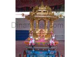 காரைக்குடி : தேவகோட்டை சுப்ரீம் @கார்ட் முன்னாள் நீதிபதி ஏ.ஆர்.லட்”மணன் குடும்பத்தினர் சார்பில், தேவகோட்டை ஷீரடி சாயிபாபா கோயிலுக்கு, தங்கதேர் வழங்கப்பட உள்ளது. இதை உருவாக்கும் பணியை, மூ.வி.செம்பொன் அருணாசலம் மேற்பார்வையில், காரைக்குடி சிற்பி சேது தியாகராஜன் மேற்கொண்டார். கடந்த 10 மாதங்களுக்கும் மேலாக நடந்த இத்திருப்பணி, முடிந்து தேவகோட்டை சாயிபாபா கோயிலில், இன்று காலை வெள்ளோட்டமும், நாளை தங்கரத சுவாமி புறப்பாடும் நடக்க உள்ளது. தங்கத்தால் ஆன இத்தேரை உருவாக்கிய சேது தியாகராஜன் கூறும்போது: தேர் செய்யும் பணி, கடந்த 10 மாதங்களாக நடந்து வந்தது. உயரம் 10 அடி, அகலம் ஐந்தரை அடி. நான்கு சக்கரங்கள் கீழே பொருத்தப்பட்டு, கையால் இழுத்து செல்லும் வகையில் அமைக்கப்பட்டுள்ளது. நான்கு சக்கர தகடையின் மேல் தேர் நிலை நிறுத்தப்பட்டுள்ளது. எண்கோண வடிவில் எட்டு தூண்கள் உள்ளன. முன்புறம் குதிரை, தேரோட்டியாக பிரம்மன், நான்கு வெண்தாமரை பெண்கள், எட்டு யாழி, எட்டு கந்தர்வர்கள், எட்டு பூதம், 16 நந்தி, எட்டு சாயிபாபா சிலை, எட்டு சூரியகாந்தி பூ , கர்ணகூடு கொண்டு அமைக்கப்பட்டுள்ளது. தென்மாவட்டங்களில் ஷீரடி சாயிபாபாவுக்கு அமைக்கப்பட்டுள்ள முதல் தங்க தேர் இதுவாகும், என்றார்.