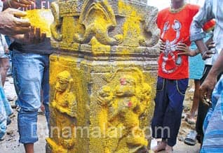 காஞ்சிபுரம்: காஞ்சிபுரம் பொய்கை ஆழ்வார் குளம் அருகே, தபசு மரம் நடுவதற்காக தோண்டப்பட்ட பள்ளத்தில், உடைந்த நிலையில், கல் துாண் ஒன்று கண்டெடுக்கப்பட்டது. சின்ன காஞ்சிபுரம் ஐதர்பேட்டை தெருவில் உள்ள, ராஜராஜேஸ்வரி ஆகாய கன்னியம்மன் கோவிலில், 34ம் ஆண்டு ஆடித்திருவிழா நடைபெற்று வருகிறது. இவ்விழாவை முன்னிட்டு, இன்று அதிகாலை தபசு மரம் ஏறும் விழா நடைபெறும் என, அறிவிக்கப்பட்டி ருந்தது. இதனால், அருகில் உள்ள பொய்கை ஆழ்வார் குளம் அருகே, தபசு மரம் நடுவதற்கு நேற்று காலை 8:00 மணிக்கு பள்ளம் தோண்டப்பட்டது. அப்போது, நான்கடி ஆழத்தில், பாறை போன்ற கல் இருப்பதாக தென்பட்டது. இதையடுத்து, அங்கு நன்றாக தோண்டியபோது, மூன்றரை அடியில் உடைந்த நிலையில், கல் துாண் ஒன்று கண்டுபிடிக்கப்பட்டது. இந்த துாணில் உள்ள நான்கு பக்கத்தில், இரண்டு பக்கத்தில் ஆஞ்சநேயர் உருவமும், மற்ற இரு பக்கங்களில், வாமனன் மற்றும் பெருமாள் உருவமும் இடம்பெற்றுள்ளது. அப்போது அங்கு திரண்டிருந்த அப்பகுதிவாசிகள், து ாணுக்கு மஞ்சள், குங்குமம் இட்டு வழிபட ஆரம்பித்தனர். இதுகுறித்து தகவல் அறிந்த வருவாய்த் துறையில், அப்பகுதிக்கு சென்று பகுதிவாசி களிடமிருந்து துாணை கைப்பற்றி, தாலுகா அலுவலகம் கொண்டு சென்றனர். இதுகுறித்து காஞ்சிபுரம் வருவாய் ஆய்வாளர் செல்வராஜ் கூறுகையில், “பொய்கை ஆழ்வார் குளம் அருகே கண்டெடுக்கப்பட்ட கல் துாணை கைப்பற்றி தாலுகா அலுவலகம் கொண்டு வந்துள்ளோம். தொல்லியல் துறைக்கு தகவல் தெரிவித்து, அவர்களிடம் ஒப்படைக்கப்படும்,” என்றார்.