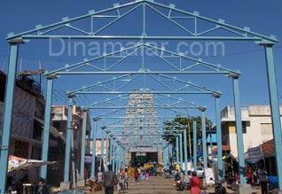 காரைக்கால் : திருநள்ளார் சனி பகவான் கோவில் ராஜகோபுர நுழைவாயில் எதிரில் இரும்பு தூண்களால் ரூ.70 லட்சம் மதிப்பில் மேற்கூரை அமைக்கும் பணி நடைபெறுகிறது. காரைக்கால் திருநள்ளாரில் பிரசித்தி பெற்ற தர்பாரண்யேஸ்வர கோவிலில் சனி பகவான் தனி சன்னதியில் அருள்பாலித்து வருகிறார். சனி பரிகார ஸ்தலமாக திருநள்ளார் விளங்கி வருவதால் நாள் தோறும் பல்லாயிரக்கணக்கில் பக்தர்கள் வருகின்றனர்.கோவிலுக்கு வரும் பக்தர்கள் அதிகாலையில் நளன் குளத்தில் நீராடிவிட்டு, பரிகாரத்திற்காக தாங்கள் அணிந்திருக்கும் ஆடைகளை குளத்திலேயே விட்டுவிட்டுச் செல்வர். நேற்று முன்தினம் சனிக்கிழமை என்பதால், பல்லாயிரக்கணக்காண பக்தர்கள் நளன் குளத்தில் நீராடினர்.பக்தர்கள் விட்டுச் சென்ற ஆடைகளை, அகற்றும் பணியில் கோவில் ஊழியர்கள் மேற்கொண்டனர். குளத்தில் தண்ணீரை தூய்மைப்படுத்தும் பணியும் மேற்கொள்ளப்பட்டது.