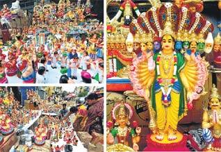 மயிலாப்பூர்: நவராத்திரி விழாவை முன்னிட்டு, மயிலாப்பூர் கபாலீசுவரர் கோவில் மாடவீதிகளில், கொலு பொம்மை விற்பனை களைகட்டி வரு கிறது. வரும் 23ம் தேதி, நவராத்திரி துவங்க உள்ளது. அதை முன்னிட்டு, சென்னையின் முக்கிய பகுதிகளில், கொலு பொம்மை விற்பனை, விநாயகர் சதுர்த்தியை ஒட்டியே துவங்கி விட்டது. மயிலாப்பூரில், கபாலீசுவரர் கோவில் மாடவீதிகளில், கொலு பொம்மைகள் விற்பனைக்கு வைக்கப் பட்டுள்ளன. கொலு பொம்மை விற்பனைக்காக வைக்கப்பட்டுள்ளது. இதில், ராமாயண கதை பொம்மைகள், ஆழ்வார்கள், நாய ன்மார்கள்,அஷ்டலட்சுமி, தசாவதார தொகுப்பு, ராமர், ராவணன் மற்றும் பல்வேறு வகையான கடவுள் பொம்மைகள் கண்களை ஈர்க்கும் விதத்தில், வைக்கப்பட்டு உள்ளன. காகித கூழ், மணல், கருங்கல், மரம் உள்ளிட்ட பல்வேறு பொருட்களில், தயாரிக்கப்பட்ட இந்த பொம்மைகளை, சென்னைவாசிகள் ஆர்வத்துடன், வாங்கி செல்கின்றனர். சிலைகள், 50 ரூபாய் முதல் 12 ஆயிரம் ரூபாய் வரை விற்கப்படுகின்றன.