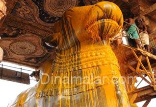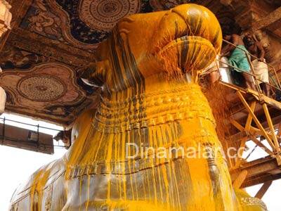தஞ்சாவூர்: தஞ்சாவூர் பிரகதீஸ்வரர் கோவிலில் சோம வாரா பிரதோஷத்தை முன்னிட்டு மகா நந்தீஸ்வரருக்கு மஞ்சள் அபிஷேகம், பாலபிஷேகம் நடந்தது.