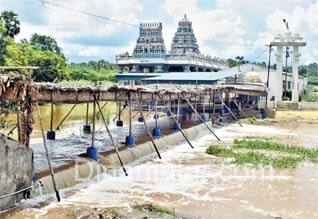 ஆனைமலை: பொள்ளாச்சி அருகே ஆஞ்சநேயர் கோவிலில் வெள்ளம் சூழ்ந்ததால், கோவில் நடை சாத்தப்பட்டது. பொள்ளாச்சி – வால்பாறை செல்லும் ரோட்டில் நா.மு.சுங்கம் அருகே பாலாற்றங்கரை ஆஞ்சநேயர் கோவில் உள்ளது. பிரசித்தி பெற்ற இக்கோவிலில், சனிக்கிழமைகளில் பொதுமக்கள் கூட்டம் அதிகளவு காணப்படும். பாலாற்றங்கரையில், நேற்றுமுன்தினம் இரவு 11:00 மணிக்கு திடீரென காட்டாற்று வெள்ளம் கரை புரண்டது. பாலாற்றங்கரை ஆஞ்சநேயர் கோவில் பாலத்தின் மீது வெள்ளப்பெருக்கு ஏற்பட்டது. பாலத்தின் இருபுறமும் தண்ணீர் சென்றதால், ÷ காவிலுக்குள் பக்தர்கள் அனுமதிக்கப்படவில்லை; நடை சாத்தப்பட்டு, பூஜை நடைபெறவில்லை. இதனால், கோவில் பகுதி வெறிச்சோடி காணப் பட்டது.