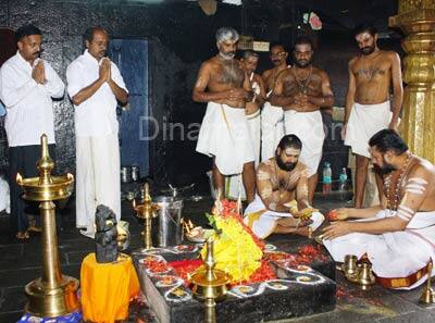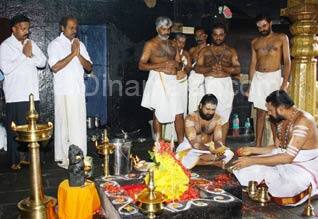 தந்திரி கண்டரரு ராஜீவரரு களபகலசத்துக்கு கோவில் மண்டபத்தில் பூஜை