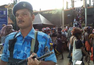 சபரிமலை டிச.ஆறு பாபர் மசூதி இடிப்பு தினத்தையொட்டி சபரிமலையில் உச்சகட்ட பாதுகாப்பு ஏற்பாடுசெய்யப்பட்டுள்ளது. சபரிமலையின் ஒவ்வொரு மூலையும் நவீன கருவிகளால் சோதனை செய்யப்பட்டு வருகிறது. ஸ்ரீகோயில், 18-ம் படி, கொடிமரம், சோபானம் ஆகிய இடங்கள் கேரள போலீஸ் மற்றும் மத்திய அதிவிரைவு படையின் கட்டுப்பாட்டுக்குள் கொண்டு வரப்பட்டுள்ளது. சிறப்பு பயிற்சி பெற்ற கமாண்டோக்கள் நவீன துப்பாக்கிகளுடன் கோயிலை சுற்றி நிறுத்தப்பட்டுள்ளனர். மத்திய ரிசர்வ் போலீசாரின் அதிரடிப்படை பிரிவினருக்கு எவ்வித நெருக்கடியையும் எதிர் கொள்வதற்கான உத்தரவுகள் பிறப்பிக்கப்பட்டுள்ளது. தேசிய பேரிடர் நிவாரணப்படையினர் தயார் நிலையில் வைக்கப்பட்டுள்ளனர். கோயிலின் எல்லா வாசல்களிலம் மெட்டல் டிடெக்டர் கருவி பொருத்தப்பட்டுள்ளது. நடைப்பந்தலில் எக்ஸ்ரே ஸ்கேனர்களில் பக்தர்களின் பைகள் ஸ்கேன் செய்யப்பட்டு வழங்கப்படுகிறது. அண்டை மாநிலங்களில் இருந்து வந்துள்ள போலீசார் கண்காணிப்பு பணியில் ஈடுபடுத்தப்பட்டுள்ளனர். சன்னிதானத்தின் சுற்றப்புறங்களில் உள்ள குப்பை தொட்டிகள் உள்ளிட்ட அனைத்து பகுதிகளும் மெட்டர் டிடெக்டர் மற்றும் நவீன கருவிகளால் சோதனை செய்யப்பட்டு வருகிறது. குப்பை கூட்டப்பட்டிருக்கும் இடங்களையும் போலீசார் விட்டுவைக்கவில்லை. கடைகளில் அடையாள அட்டை இல்லாமல் பணியாற்றி வந்த தொழிலாளர்கள் வெளியேறி விட்டனர்.பம்பையில் கணபதி கோயில் அருகில் அனைத்து பக்தர்களும் மெட்டல் டிடெக்டர் பரிசோதனைக்கு பின்னரே மலையேற அனுமதிக்கப் பட்டனர்.பம்பையில் இருந்து சன்னிதானம் வந்து தரிசனம் நடத்துவதற்கிடையில் மூன்று இடங்களில் பக்தர்கள் மெட்டல் டிடெக்டர் மூலம் பரிசோதிக்கப் படுகின்றனர். சன்னிதானத்தில் அறைகளில் தங்கியிருப்பவர்கள் பட்டியல் சேகரிக்கப்பட்டு அவையும் போலீசாரின் ஆய்வுக்கு உட்படுத்தப்பட்டுள்ளது.