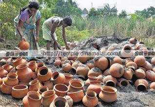 காஞ்சிபுரம்: பொங்கல் பண்டிகைக்காக மண்பானை தயாரிக்கும் பணி, தீவிரமாக நடந்து வருகிறது. தமிழர்களின் பண்டிகைகளில், பொங்கல் முக்கிய பண்டிகையாக கொண்டாடப்படுகிறது. அன்றைய தினத்தில், விவசாயிகள் புதுப்பானையில் பொங்கலிட்டு, சூரிய பகவானுக்கு படைத்து வழிபடுவது வழக்கம். இதற்காக, மண் பானையை அதிகம் பேர் விரும்பி வாங்குவர். பொங்கலை முன்னிட்டு, காஞ்சிபுரம் திருக்காலிமேடு பகுதியில் மண்பானை தயாரிக்கும் பணி, தற்போது தீவிரமாக நடந்து வருகிறது.குடும்பத்திற்கு தகுந்தாற்போல், ஒரு படி, முக்கால்படி, அரைப்படி, கால்படி என, நான்கு வகைகளில் பொங்கல் பானை செய்யப்படுகின்றன. இதற்காக, 30, 25, 20, 15 ரூபாய் என்ற விலைக்கு மொத்தமாக விலைக்கு கொடுப்பர். இதை மொத்தமாக வாங்கும் வியாபாரி கள், 60, 50, 40, 30 ரூபாய் என்ற விலைக்கு விற்பனை செய்வர். இதுகுறித்து, தொழிலாளர் முனுசாமி கூறுகையில், ”எங்கள் குல தொழிலே இதுதான். இதற்கு, மண் தேடி கொண்டு வந்து பானைகளை செய்து வருகிறோம். ஏரிகளில் சவுடு மணல் எடுத்தால், போலீசார் தடுக்கின்றனர்,” என்றார்.