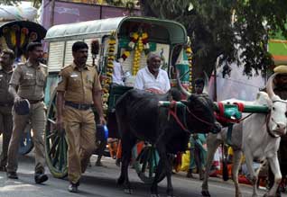 பழநி: தைப்பூச விழாவிற்காக காரைக்குடி நகரத்தார் காவடி குழுவினர் மாட்டுவண்டியில் வைரவேலை போலீஸ் பாதுகாப்புடன் பழநிக்கு கொண்டு வந்தனர். சிவகங்கை மாவட்டம் காரைக்குடி 94 நகரத்தார் காவடி குழுவினர் நூற்றுக்கு மேற்பட்டவர்கள் பலநூறு ஆண்டுகளாக தைப்பூச விழாவிற்கு பாதயாத்திரையாக பழநிகோயிலுக்கு வருகின்றனர். இவ்வாண்டு ஜன.,27ல்கண்டனூரிலிருந்து காவடிகளுடன் புறப்பட்டனர்.