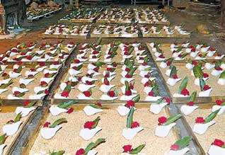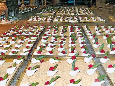 மூலவருக்கு, சாற்றுவதற்காக, வேலுார் மற்றும் பெங்களூரில் இருந்து, 1,000 கிலோ பூக்கள் பிரத்யேகமாக வரவழைக்கப்பட்டன. நேற்று காலை முதல், மாலை வரை, திரளான பெண்கள், இந்த பூக்களை மாலையாக தொடுக்கும் பணியில்தங்களை ஈடுபடுத்தி கொண்டனர்.