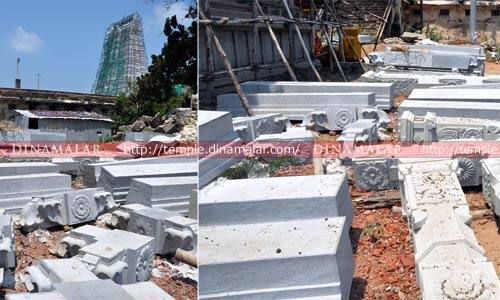 ராமேஸ்வரம்: ராமேஸ்வரம் ராமநாதசுவாமி கோயிலில், ரூ.ஒரு கோடி செலவில் புதிய கருங்கல் மண்டபம் அமைக்க, பெங்களூருவில் இருந்து கருங்கல் தூண்கள் வந்துள்ளன. ராமேஸ்வரம் திருக்கோயிலில் கும்பாபிஷேகம் நடத்த ரூ. 7 கோடி செலவில் கிழக்கு ராஜகோபுரம், மூன்றாம் பிரகாரம், சுவாமி, அம்மன் சன்னதிகளில் மராமத்து, பெயிண்ட் பூசுதல், சுவாமி, அம்மன், பஞ்சமூர்த்திகள் விமானங்கள் புதுப்பிப்பு போன்ற பணிகள் நடக்கிறது. கோயிலில் பர்வதவர்த்தினி அம்மன் சன்னதி முன்புள்ள, நூறு ஆண்டு பழமையான ஓட்டு கொட்டகையை அகற்றி விட்டு, ரூ. 1 கோடி செலவில் கருங்கல்லில் முகப்பு மண்டபம் அமைக்க, பெங்களூரு சிருங்கேரி மடம் சுவாமிகள் முன்வந்துள்ளார். அதன்படி, பெங்களூருவில் வடிவமைக்கப்பட்ட கருங்கல் தூண்கள், நேற்று கோயிலுக்கு வந்தது. இன்னும் சில தினங்களில், இத்தூண்களில் சிற்ப கலை பணிகள் முடிந்ததும் அம்மன் சன்னதியில் முகப்பு மண்டபம் அமைக்கும் பணி துவங்கும் என, கோயில் ஊழியர்கள் தெரிவித்தனர்.