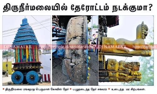 திருநீர்மலை: திருநீர்மலை ரங்கநாத பெருமாள் கோவிலில், சக்கரங்கள் பழுதானதால், தேரோட்டம் நடைபெறுமா என, சந்தேகம் எழுந்து உள்ளது. பல்லாவரத்தை அடுத்த திருநீர்மலையில், ரங்கநாத பெருமாள் கோவில் உள்ளது. 108 திவ்யதேசங்களில் ஒன்றான அந்த கோவிலில், ஆண்டுதோறும் பங்குனியில் நீர்வண்ணர் உற்சவம், சித்திரையில் ரங்கநாதர் உற்சவம் ஆகிய விழாக்களுக்கு, கோவில் தேரோட்டம் நடைபெறும். ரங்கநாத பெரு மாள் கோவில் தேரின் நான்கு சக்கரங்களும் பழுதடைந்து உள்ளன; தேரில் உள்ள சிற்பங்களும் சேதமடைந்து உள்ளன. தேரோட்டத்திற்கு சில நாட்களே உள்ள நிலையில், பழுதாகி உள்ள தேர் சக்கரங்கள் சீரமைக்கப்படவில்லை. இதனால், தேரோட்டம் நடைபெறுமா என, சந்தேகம் எழுந் துள்ளது. கோவில் செயல் அலுவலர் குமரேசன் கூறியதாவது: தேரில் பராமரிப்பு பணிகள் நடைபெறுகின்றன. தேருக்கு ‘பிரேக்’ அமைப்புடன் கூடி ய, இரும்பாலான நான்கு புதிய சக்கரங்கள் செய்வதற்கு, ‘பெல்’ நிறுவனத்திடம் கேட்டு உள்ளோம். வரும், 15ம் தேதி, சக்கரங்கள் வந்து விடும் என, எதிர்பார்க்கிறோம். இவ்வாறு, அவர் கூறினார்.