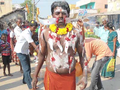 நல்லாண் பிள்ளை பெற்றாளைச்சேர்ந்த முருக பக்தர் ராஜி, தனது வாயில் வேலுக்கு பதிலாக அருவாளை சொருகி பக்தியை வெளிப்படுத்தினார். அத்துடன் உடல் முழுவதும் குத்துவாளை போன்ற கத்தியை சொருகி இருந்தார். இவரின்பக்தி பார்ப்பவர்களை மெய்சிலிர்க்க வைத்தது.