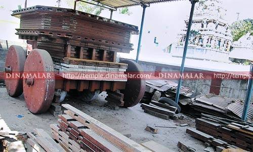36 அடி உயரம்: தேர் திருவிழாவின்போது, பயன்படுத்தப்பட்டு வரும், தற்போது உள்ள மரத்தேர், பலவீனம் ஆனதை தொடர்ந்து, அதற்கு பதிலாக, 36 அடி உயரத்தில், 40 லட்சம் ரூபாய் செலவில், புதிய தேர் செய்ய திட்டமிடப்பட்டது. அதற்கான நிதியை, பெரும் கொடையாளர்கள் மூலம் ÷ மற்கொள்வது என, தீர்மானிக்கப்பட்டது. கடந்த, 2013ம் ஆண்டு, தேரின் திருப்பணிகள் சென்னை, திருமழிசை, ஸ்தபதி கஜேந்திரன் குழுவினரால் மேற்கொள்ளப்பட்டது. தொடர்ந்து நடைபெற்று வந்த பணிகளில், 15 அடி உயரத்திற்கு தேவசாசனம், சிம்மாசனம் வரை பணிகள் முடிந்துள்ளன. சிற்ப வேலைப்பாடுகளுக்கான பணிகள் நடைபெற்று வந்தன. திட்ட மதிப்பீட்டையும் கடந்து, இதுவரை, 50 லட்சம் ரூபாய் செலவிடப்பட்டு உள்ளது.