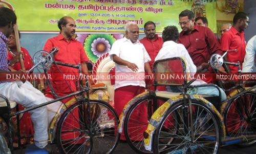 செங்கல்பட்டு: மேல்மருவத்தூர் ஆதிபராசக்தி சித்தர் பீடத்தில், தமிழ் புத்தாண்டை ஒட்டி, செவ்வாடை பக்தர்களுக்கு, 15 லட்சம் ரூபாய் மதிப்பில், நலத்திட்ட உதவிகளை, பங்காரு அடிகளார், நேற்று வழங்கினார். மேல்மருவத்தூர் ஆதிபராசக்தி சித்தர் பீடத்தில், மன்மத தமிழ் புத்தாண்டு விழா, கடந்த 13ம் தேதி துவங்கியது. இந்த விழாவில், இலவச சித்த மருத்துவ முகாம், கலச விளக்கு வேள்வி பூஜை நடைபெற்றன. அதை தொடர்ந்து, நேற்று அதிகாலை காலை 3:00 மணிக்கு, ஆதிபராசக்தி அம்மனுக்கு சிறப்பு அபிஷேகம் நடைபெற்றது. இதையடுத்து, செவ்வாடை பக்தர்களுக்கு, நலத்திட்ட உதவிகள் வழங்குதல் மற்றும் இலவச திருமணங்கள் நடைபெறும் விழாவிற்கு, ஆதிபராசக்தி ஆன்மிக இயக்க தலைவர் லட்சுமி பங்காரு அடிகளார், தலைமை தாங்கினார். ஆதிபராசக்தி ஆன்மிக இயக்க துணை தலைவர் செந்தில்குமார், முன்னிலை வகித்தார். காஞ்சிபுரம் மாவட்ட தலைவர் கொண்டாரெட்டியார், வரவேற்றார். பங்காரு அடிகளார், 640 செவ்வாடை பக்தர்களுக்கு, 15 லட்சம் ரூபாய் மதிப்பில் நலத்திட்ட உதவிகளும், சோத்துப்பாக்கம் நடுநிலைப் பள்ளிக்கு, 75 கல்வி உபகரணங்களும், 17 அரசு உயர்நிலைப் பள்ளி மாணவர்களுக்கு சீருடைகளும், ஏழை மாணவர்களுக்கு கல்வி உதவித்தொகையும், சித்த மருத்துவத்திற்கு, 1.08 லட்சம் ரூபாய்; அன்னை இல்லத்திற்கு, 50 ஆயிரம் ரூபாய்; முடநீக்கவியல் கல்லூரிக்கு, இரண்டு லட்சம் ரூபாய் வழங்கி, 22 ஜோடிகளுக்கு இலவச திருமணம் செய்து வைத்து, சீர்வரிசைகளை வழங்கினார். சென்னை உயர் நீதிமன்ற முன்னாள் நீதிபதி ராஜேஸ்வரன், சித்தர்பீட புலவர் சுந்தரேசன் உட்பட, பலர் கலந்து கொண்டு பேசினர். நிகழ்ச்சியில், ஆயிரக்கணக்கான பக்தர்கள் கலந்து கொண்டனர்.