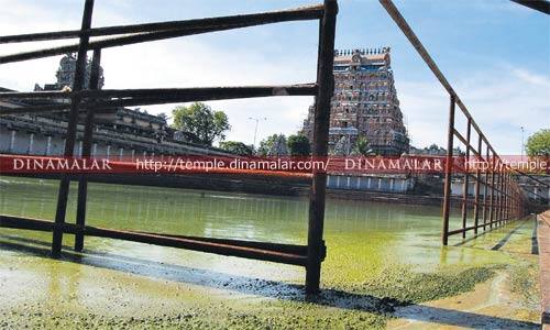 சிதம்பரம்: நடராஜர் கோவில் சிவகங்கை குளத்தில் கோவிலில் சுத்தம் செய்யும் அழுக்குகள், ரசாயனம் போன்றவை கலந்து மாசு அடைந்துள்ளதால் பக்தர்கள் வேதனை அடைந்துள்ளனர். சிதம்பரம் நடராஜர் கோவிலில் உள்ள சிவகங்கை குளம், காசி கங்கை புண்ணிய நதிக்கு நிகரானது. இந்த தீர்த்த குளத்தில் நடராஜ பெருமான் பக்தர்களுக்கு தீர்த்தவாரி அளிப்பது சிறப்பு. வரும் 1ம் தேதி நடைபெற உள்ள நடராஜர் கோவில் கும்பாபிஷேகத்தில் பல லட்சம் பக்தர்கள் பங்கேற்பார்கள் என எதிர்பார்க்கப்படுகிறது. கும்பாபிஷேகத்தையொட்டி கோவில் சுவர்கள், ஆயிரங்கால் மண்டபம் போன்றவை சுத்தம் செய்யும் அழுக்கு தண்ணீர் சிவகங்கை குளத்தில் கலக்கிறது. மேலும் கோபுரம், மதில் சுவர், கருங்கல் தூண்கள், சிலைகள் போன்றவைகளை சுத்தம் செய்ய பயன்படுத்தப்படும் ரசாயனம் (கெமிக்கல்) பெயிண்ட் போன்ற கழிவுகள் கலப்பதால் தண்ணீர் மாசு அடைந்துள்ளது.தீர்த்த குளத்தில் கழிவுகள் கலந்து அதன் அழுக்குகள் அடுக்கடுக்காக குளத்தின் கிழக்கு பகுதியில் அதிக அளவில் மிதக்கிறது. மேலும், தண்ணீர் தடிமன் ஏற்பட்டு கரும் பச்சை நிறமாக மாறி துர்நாற்றம் வீசுகிறது. இதனால் கோவிலுக்கு வரும் பக்தர்கள் தீர்த்த குளமான சிவகங்கை குளத்தில் இறங்க அச்சம் அடைந்துள்ளனர். எனவே, மாவட்ட நிர்வாகம் சுகாதார அதிகாரிகள் மூலம் சிவகங்கை குளத்து தண்ணீரை ஆய்வு செய்து நடவடிக்கை எடுக்க வேண்டும்.