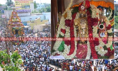 பொன்னேரி: அருள்மிகு கரிகிருஷ்ண பெருமாள் கோவில் தேரோட்டத்தில், ஆயிரக்கணக்கான பக்தர்கள் திரளாக பங்கேற்று தேரின் வடம் பிடித்து இழுத்து வழிபட்டனர். பொன்னேரி அருள்மிகு சவுந்தர்ய வள்ளி தாயார் சமேத கரிகிருஷ்ண பெருமாள் கோவில் பிரம்மோற்சவ விழாவின் ஏழாம் நாளான நேற்று, தேர்த்திருவிழா நடந்தது. வண்ணமிக பூக்கள் மற்றும் துணிகளால் அலங்கரிக்கப்பட்ட, 36 அடி மரத்தேரில் ஸ்ரீதேவி, பூதேவி சமேதராய் உற்சவ பெருமான் அருள்மிகு கரிகிருஷ்ண பெருமாள் வீற்றிருந்தார். காலை, 9:00 மணிக்கு, நிலையில் இருந்து புறப்பட்ட தேர் புதிய தேரடி தெரு, தாயுமான் செட்டி தெரு, நீலி அப்பாதுரை தெரு, தண்டபாணி தெரு ஆகிய வீதிகளின் வழியாக வலம் வந்தது. பொன்னேரி சுற்றியுள்ள கிராமங்களிலிருந்து ஆயிரக்கணக்கான பக்தர்கள், தேரினை வடம் பிடித்து இழுத்து, பெருமாளை வழிபட்டனர். மாடவீதிகள் சுற்றி வந்த திருத்தேர் மாலையில், ஹரஹரன் பஜார் வழியாக தேரடியின் நிலையை அடைந்தது.