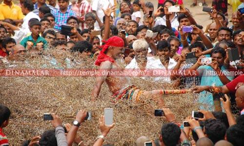 தூத்துக்குடி: தூத்துக்குடி மாவட்டம் கோவில்பட்டி அருகேயுள்ள புங்கவர்நத்தம் கிராமத்தில் காளியம்மன் கோயில் திருவிழாவில், முள் படுக்கையில் துள்ளிக்குதித்து பக்தர்களுக்கு சாமியார் அருள்வாக்கு சொன்னார். புங்கவர்நத்தம் காளியம்மன் கோயில் திருவிழா ஆண்டு தோறும் நடந்து வருகிறது. இந்தாண்டு திருவிழா இரு தினங்களுக்கு முன்பு துவங்கியது. முதல்நாளில் காளியம்மனுக்கு சிறப்பு பூஜைகள் நடந்தது. இரவில் அம்மன் சப்பரத்தில் பவனி வந்து பக்தர்களுக்கு காட்சியளித்தார். இரண்டாம் நாள் விழாவில் அம்மனுக்கு சிறப்பு அபிஷேக ஆராதனைகள் நடந்தது. அதன் பிறகு ஊட்டு எடுத்தல் நிகழ்ச்சி நடந்தது. அதன் பின் சுடலை மாடசுவாமி மயான வேட்டை நிகழ்ச்சி நடந்தது. பின் கோயில் முன்பாக 6 அடி உயரம். அகலத்தில் முட்கள் நிரப்பப்பட்டது. அதில் சுடலை மாடசாமியாக வந்தவர் துள்ளிக்குதித்தும், படுத்து உருண்டும் பக்தர்களுக்கு அருள் வாக்கு வழங்கினார். பின் பக்தர்களுக்கு அன்னதானம் வழங்கப்பட்டது. பொதுமக்கள் கூறியதாவது: ஆண்டு தோறும் காளியம்மன் திருவிழா நடக்கும். அப்போது உலக நன்மை வேண்டியும், மழை வளம் செழிக்கவும், மக்கள் நல்ல சுகத்துடன் வாழவும் சுவாமி முள் படுக்கையில் துள்ளி குதித்தும், படுத்து உருண்டும் அருள் வாக்கு சொல்வார். அவர் சொல்வது பழிக்கும், தொடர்ந்து இந்த திருவிழாவை ஆண்டு தோறும் நடத்தி வருகிறோம், என அவர்கள் தெரிவித்தனர்.