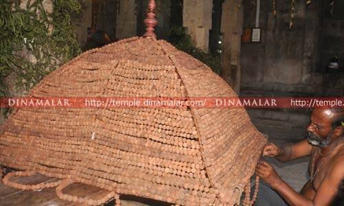 திருப்புத்தூர்: திருப்புத்தூர் திருத்தளிநாதர் கோயில் மூலவர் கர்ப்ப கிரகத்தின் கூரையில் ருத்ராட்ச விதானம் பிரதோஷக்குழுவினர் மற்றும் பக்தர்களால் அமைக்கப் பட்டுள்ளது. நேபாளத்திலுள்ள காட்மாண்டில் இருந்து ஐந்து முக வடிவிலான சுமார் 16 ஆயிரம் ருத்ராட்சங்கள் வாங்கி வரப் பட்டது. குன்றக்குடி பொன்னம்பல அடிகள் விதான நிர்மாணப் பணியை துவக்கி வைத்தார். திருத்தளிநாதர் மூலவர் கர்ப்ப கிரகத்தில் தாமிரக் கம்பியால் வலை பின்னப்பட்டு, அதில் ருத்ராட்சங்கள் பொருத்தப்பட்டு, பிரமிட் வடிவிலான கோபுர விதானம் அமைக்கப்பட்டுள்ளது. வைகாசி விசாக பெருவிழா நிறைவாக நேற்று நடந்த திருவீதி உலாவில் சுவாமி-அம்பாள் வாகனக் கூரையாக இந்த ருத்ராட்ச விதானம் அமைக்கப்பட்டிருந்தது.