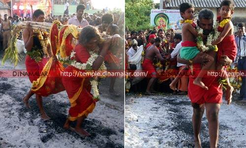 பழநி: கே.வேலுார், மண்டுகாளியம்மன் கோவில் திருவிழாவில், வெளிமாநிலம், வெளிமாவட்டங்களைச் சேர்ந்த, 1,000த்திற்கும் மேற்பட்ட பக்தர்கள், பூக்குழி இறங்கி நேர்த்திக்கடன் செலுத்தினர். திண்டுக்கல் மாவட்டம், நெய்க்காரப்பட்டி அருகேயுள்ள, கே.வேலுார் மண்டுகாளியம்மன் கோவிலில், கடந்த மூன்று நாட்களாக, ஆண்டு திருவிழா நடந்தது. பக்தர்கள், சண்முக நதியிலிருந்து தீர்த்தக்குடங்கள் எடுத்தும், அலகு குத்தியும், தீச்சட்டிகள் எடுத்தும் சிறப்பு வழிபாடு செய்தனர். நேற்று காலை, கேரளா, மதுரை, திருச்சி, கோவை, சேலம் மாவட்டம் மற்றும் நெய்க்காரப்பட்டி, பாப்பம்பட்டி, காவலப்பட்டியைச் சேர்ந்த, 1,000த்திற்கும் மேற்பட்ட பக்தர்கள், குழந்தைகளுடனும், கரும்புத் தொட்டில் எடுத்தும், பிரத்யேகமாக அமைக்கப்பட்ட அக்னி குண்டத்தில் தீ மிதித்தும் (பூக்குழி இறங்குதல்) நேர்த்திக்கடன் செலுத்தினர்.