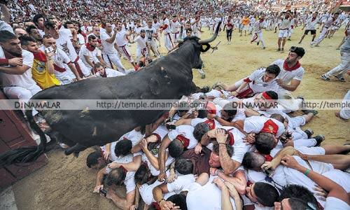 மேட்ரிட்: இளைஞர்களின் எலும்புகளை உடைத்து, ரத்தக் களறியாக்கும், ஸ்பெயின் நாட்டு, ‘சென் பார்மின்’ திருவிழா துவங்கிவிட்டது. ஸ்பெயின் நாட்டில் ஆண்டுதோறும் ஒன்பது நாட்கள் நடக்கும், ‘சென் பார்மின்’ என்னும் காளை ரேஸ், 6ம் தேதி துவங்கி, வரும் 1௩ம் தேதி நள்ளிரவு 12:00 மணியுடன் முடிவடைகிறது. இதில் கலந்து கொள்வதற்காக, உலகம் முழுவதிலும் இருந்து ஆயிரக்கணக்கான இளைஞர்கள், பெம்பலோனா சதுக்கத்தில் ஒன்று திரண்டிருக்கின்றனர். இளைஞர்களின் ஆட்டம், பாட்டத்துடன் துவங்கிய இந்த விழாவை காண, வெ ளிநாட்டு சுற்றுலா பயணிகள் அதிகளவில் வந்துள்ளனர். ஓரிடத்தில் அடைத்து வைக்கப்பட்ட காளை மாடுகள் உசுப்பேற்றப்பட்டு (கோபமூட்டி), வெ ளியில் திறந்து விடப்படும். குறுகலான, 850 மீ., நீளமுள்ள சாலைகளில், சீறிப் பாய்ந்து வரும் காளைகளுக்கு முன், இளைஞர்கள் தங்கள் வீரத்தை காட்டுவர். எழுத்தாளர் ஆர்னெஸ்ட் ஹெமிங்வேயால் பிரபலமான, இந்த காளை ரேசில், பாய்ந்து வரும் காளைகள், எதிரில் வரும் இளைஞர்களை முட்டி, அவர்களின் எலும்புகளை உடைத்தும், கொம்பால் குத்தி ரத்தக் களறியாக்கினாலும், அனைவரும் புன்சிரிப்புடன் காணப்படுவர். அட, இது நம்மூரு ஜல்லிக்கட்டு!