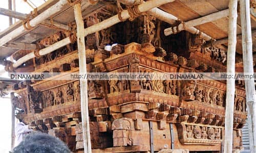 திருப்பூர்: வலுப்பூர் அம்மன் கோவிலுக்கு,30 டன் மரத்தில், 320க்கும் மேற்பட்ட சிற்பங்களுடன், புதிய தேர் செய்யும் பணி நடந்து வருகிறது.திருப்பூர் அடுத்துள்ளது, வலுப்பூர் அம்மன் கோவில். இங்கு, புதிதாக தேர் செய்யும் பணி நடந்து வருகிறது. தெய்வ காரியங்களுக்கு மட்டும் பயன்படுத்தப்படும், 20க்கும் மேற்பட்ட இலுப்ப மரங்களில், 700 சதுர அடியில், 30 டன் மரத்தில் இத்தேர் உருவாக்கப்படுகிறது. சக்கரம், அச்சு என, ஒவ்வொன்றும் மிக நேர்த்தியாகவும், அழகிய சிற்ப வேலைப்பாடு களுடனும் உருவாக்கப்படுகிறது. முதலில் பூதப்பார் மண்டபம்; அடுத்து, சிறிய உருதளம், பெரிய உருதளம், நாராசனம், தேவாசனம் மற்றும் சுவாமி எழுந்தருளும் சிம்மா சனம் என, ஐந்து நிலைகளுடன், தேர் கும்பத்தையும் சேர்த்து, 29.25 அடி உயரத்தில், அமைக்கப்படுகிறது. தெய்வங்கள், மனிதர்கள், விலங்கு கள் என, 320க்கும் மேற்பட்ட பொம்மைகள் செய்து, சட்டத்தில் ஒவ்வொன்றாக இணைத்து, பெரிய தேராக உருவாக்கி வருகின்றனர். இப்பணியில் ஈடுபட்டுள்ள, பெரம்பலூர் மாவட்டம் அரும்பாவூரை சேர்ந்த ஸ்தபதி மதிவாணன் கூறும்போது, ""தற்போது, கோவில்களுக்கு தேர் செய்வது குறைந்து வருகிறது. தேருக்கு, இலுப்பை மரம் மட்டுமே பயன்படுத்தப்படும். இதை கரையான், பூச்சிகள் அரிக்காது; நாளாக நாளாக இறுகி, கல் போல் மாறிவிடும். ""தேர் சிற்ப சாஸ்திரங்கள் அடிப்படையில், ஒவ்வொரு படி நிலையும் உருவாக்கப்படுகிறது. இதற்காக, பெரம்பலூரில் இருந்து, 30 டன் மரங்கள் கொண்டு வரப்பட்டுள்ளன. தேர் சிற்ப கலை, தற்போது அழிந்து வருகிறது. பழமையான தேர்களை புதுப்பிக்கவும், பழுதடைந்தவற்றுக்கு பதிலாக, புதிய தேர் செய்யவும், அரசு நடவடிக்கை எடுக்க வேண்டும், என்றார்.