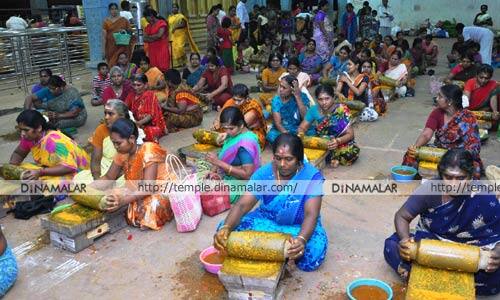 காரைக்குடி: காரைக்குடி மீனாட்சிபுரம் முத்து மாரியம்மன் கோயிலில், ஆடியை முன்னிட்டு, ஒவ்வொரு வெள்ளிக்கிழமையும் சிறப்பு அபிஷேக ங்கள் நடக்கின்றன. அம்மனை குளிர்விக்கும் வகையில், இன்று முதல் வெள்ளியை முன்னிட்டு, பச்ச மஞ்சள் அபிஷேகம் நடக்கிறது. நேற்று மாலை 5 மணியிலிருந்து, பக்தர்கள் கோயில் பிரகாரத்தில் உள்ள 35-க்கும் மேற்பட்ட அம்மியில் மஞ்சள் அரைக்க ஆரம்பித்தனர். இரவு 10 மணி வரை அரைக்கும் பணி தொடர்ந்தது. இன்று காலை ஆறு மணி முதல் மஞ்சள் அரைக்க உள்ளனர். மதியம் 12.30 மணிக்கு அபிஷேகம் நடக்கிறது. இதற்காக 700 கிலோ வரை பெறப்பட்டுள்ளது. மஞ்சள் அரைக்கும் பணியில் ஆயிரத்துக்கும் மேற்பட்ட பெண்கள் ஈடுபட்டுள்ளனர்.