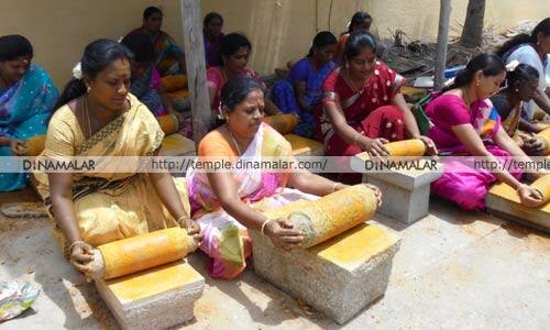 கீழக்கரை: உத்தரகோசமங்கையில் உள்ள வராகி அம்மனுக்கு, பெண்கள் மஞ்சள் அரைத்து பூசி, சிறப்பு பூஜை நடத்தி வழிபட்டனர்.உத்தரகோசமங்கையில் மங்கை மாகாளியம்மன் எனும் வராகி அம்மன் தனி சன்னதி கோயிலாக உள்ளது. இக்கோயிலில் வராகி நவராத்திரி உற்சவம் கடந்த ஜூலை 1 ல் துவங்கி இன்று (ஜூலை 25) இரவு 8 மணி வரை நடந்து வருகிறது. இதையொட்டி, கோயிலில் உள்ள ஏராளமான அம்மிக்கற்களில் பெண்கள், நேற்று பச்சை விரலி மஞ்சளை அரைத்து ஆறடி சுயம்பு பீடத்தில் உள்ள அம்மனுக்கு பூசி சாந்தப்படுத்தும் நிகழ்ச்சி நடந்தது. பின்னர், கோரிக்கைகளை அங்குள்ள பெட்டியில் எழுதி போட்டனர். முன்னோர்கள் வாங்கிய பூர்வ ஜென்ம சாபங்களை போக்கும் சக்தியாக அம்மன் விளங்குவதால், இக்கோயிலில் ஆடி மாதத்தில் பக்தர்கள் அதிகளவு வருகின்றனர்.