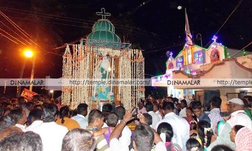 காரைக்கால்: காரைக்கால் பிள்ளைத்தெரு வாசல் புனித சந்தனமாதா ஆலய ஆண்டு திருவிழாவில் மின் அலங்கார தேர் பவனி நடந்தது. காரைக்கால் பிள்ளைத்தெரு வாசலில் புனித சந்தனமாதா ஆலய ஆண்டு திருவிழா கடந்த 24ம் தேதி கொடியேற்றத்துடன் துவங்கியது. 25ம் தேதி சிறிய தேர்பவனியும் அதைத்தொடர்ந்து நற்செய்தி கூட்டம் நடந்தது.நேற்று முன்தினம் 26ம் தேதி திருவிழா திருப்பலியும் மின்விளக்கு அலங்கார தேர்பவனியும் நடந்தது. இதில், ஏராளமான பொதுமக்கள் கலந்து கொண்டனர். நேற்று திருவிழா திருப்பலியும் கொடிஇறக்கம் நடந்தது. விழாவிற்கான ஏற்பாடுகளை பங்கு தந்தைகள் மற்றும் கிராம நிர்வாகிகள் சிறப்பாக செய்திருந்தனர்.