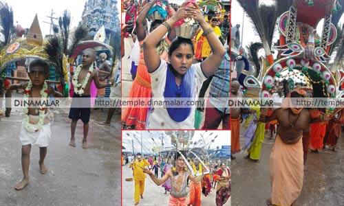 காவடிகளுடன்....:ஆடிப்பூர விழாவை ஒட்டி, சென்னை வண்ணாரபேட்டை, தண்டையார்பேட்டை, கொருக்குபேட்டை, மண்ணடி, புளியந்தோப்பு மற்றும் அதை சுற்றியுள்ள பகுதிகளில் இருந்து, 30 ஆயிரத்திற்கும் மேற்பட்ட பக்தர்கள், நேற்று முன்தினம் இரவே, திருத்தணிக்கு வந்து தேவஸ்தான குடில்கள், தனியார் விடுதிகள் மற்றும் திருமண மண்டபங்களில் தங்கினர். நேற்று காலை 8:00 மணி முதல், பக்தர்கள் தங்களது வேண்டுதலை நிறைவேற்ற, உடல் முழுவதும் அலகு குத்தியும், மலர் மற்றும் மயில்காவடிகள் எடுத்து, பம்பை, உடுக்கை முழங்க, கிராமிய கலை நிகழ்ச்சிகளுடன் ஆண், -பெண் மற்றும் குழந்தைகள் மொட்டையடித்து சரவணப்பொய்கையில் புனித நீராடினர். பின்னர், மலைப்படிகள் வழியாக சென்று, மூலவரை தரிசித்தனர். மேலும், சில பக்தர்கள் பால்குடம் எடுத்து சென்று வழிபட்டனர்.