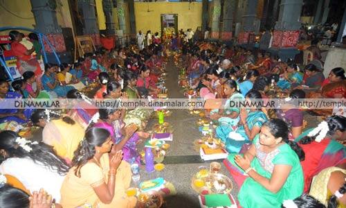 ஓமலூர்: கோட்டை மாரியம்மன் கோவிலில், உலக நன்மை வேண்டி, திருவிளக்கு பூஜை நடந்தது. ஓமலூர் கோட்டை மாரியம்மன் கோவிலில், உலக நன்மை வேண்டி, 1,008 திருவிளக்கு பூஜை நடந்தது. இதையடுத்து, ஸ்ரீலட்சுமி கணபதி ஹோமம், 1,008 திருவிளக்கு பூஜை நடந்தது. இதில், பெண்கள் பங்கேற்று, உலக நன்மை வேண்டியும், மாங்கல்யம் நிலைக்க வேண்டியும் வழிபாடு செய்தனர். பூஜையில் கலந்து கொண்ட பெண்கள் அனைவருக்கும், புடவை, ஸ்வாமி படம், குங்குமச்சிமிழ் வழங்கப்பட்டது. இதில், ஏராளமான பெண்கள், பக்தர்கள் கலந்து கொண்டனர். ஏற்பாடுகளை, ஓம் ஸ்ரீ ஆன்மீக நற்பணி குழு நிர்வாகிகள் ராஜேந்திரன், மணிகண்டன் ஆகியோர் செய்தனர்.