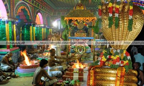திருச்சி: திருச்சி, ஸ்ரீரங்கம் கோவிலில், 43 உப சன்னிதிகள் மற்றும் 11 கோபுரங்களுக்கு, நாளை (செப். 9ல்) கும்பாபிஷேகம் நடக்கிறது. இதற்கான முதல் யாகசாலை பூஜை, நேற்றிரவு துவங்கியது. கும்பாபிஷேகத்தை முன்னிட்டு, கொள்ளிடம் ஆற்றில் இருந்து, வெள்ளி கடங்களில் புனித நீர் எடுத்து வரப்பட்டது. யாகசாலையில் உபநாச்சியார்களுடன் நம்பொருமாள் எழுந்தருளி அருள்பாலித்தார். கும்பாபிஷேகத்தை முன்னிட்டு, யாகசாலையில், தங்க ஆதிஷேசன் வாகனத்தில், தங்க குடத்தில் புனித நீர் வைக்கப்பட்டுள்ளது. காலை, 11.30 மணிக்கு இரண்டாம் கால யாகசாலை பூஜை தொடங்கியது.