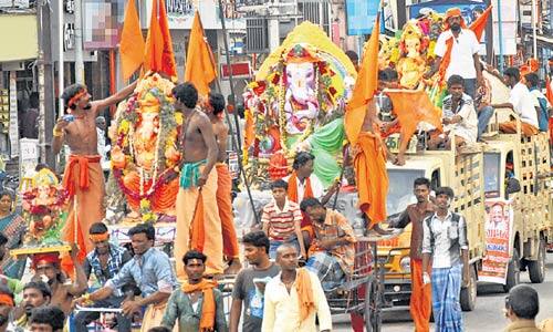 மதுரை: மதுரை மாசி வீதிகளில் இந்து அமைப்பினர் சார்பில் 60க்கும் மேற்பட்ட விநாயகர் சிலைகள் ஊர்வலம் நடந்தது.